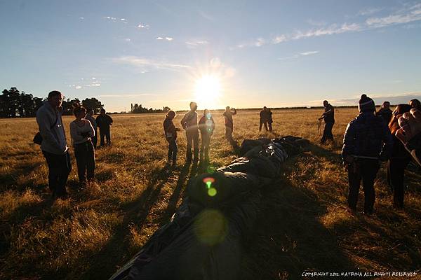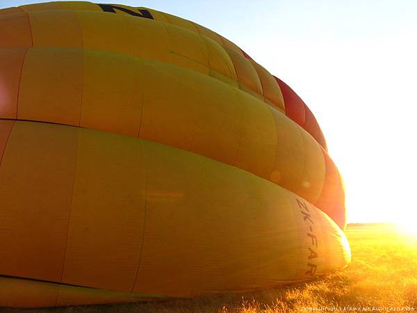溫和的光芒照射在一望無際的草皮以及熱汽球上,